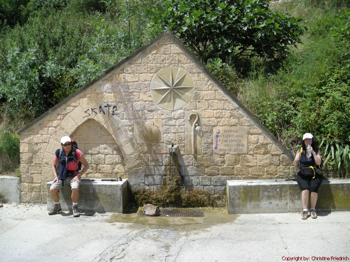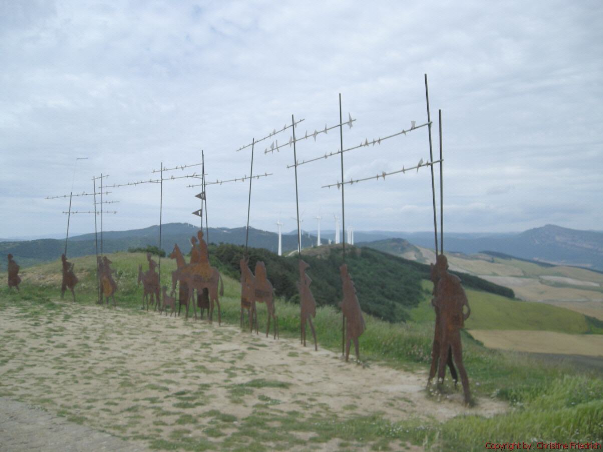 Es gibt immer wieder schöne Fotomotive und Windräder zu sehen. Nach etwa zwei Stunden hat Marina die erste Blase auf der Ferse. Ich helfe ihr mit Blasenpflaster aus, und wir marschieren weiter. Gegen 11:30 kommen wir durch den Ort Zariquiegui, der außer einer spätromanischen Kirche (die geschlossen ist) nichts bietet. Doch: einen Brunnen mit frischem Wasser! Nach einer kurzen Rast geht es weiter. Marina leidet schweigsam. Mittlerweile hat sie auch auf der anderen Ferse eine Blase. Noch habe ich genug Blasenpflaster! Der Weg wird immer schmäler, steiniger und steiler. Da passiert etwas, was ich mir nie hätte vorstellen können. Ich bekomme in meinem rechten Bein Krämpfe. An verschiedenen Stellen. Ich beiß die Zähne zusammen, weiter!