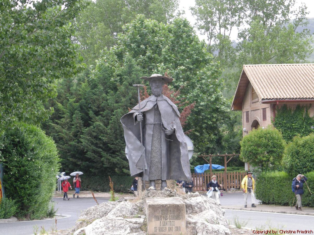 Am Ortsanfang zeigt ein Pilgerdenkmal den Platz, wo damals die Pilger aus Roncesvalles und die aus Somport zusammentrafen. Es wird gesagt, dass die Pilger sich nicht nur trafen, sondern auch umarmten.