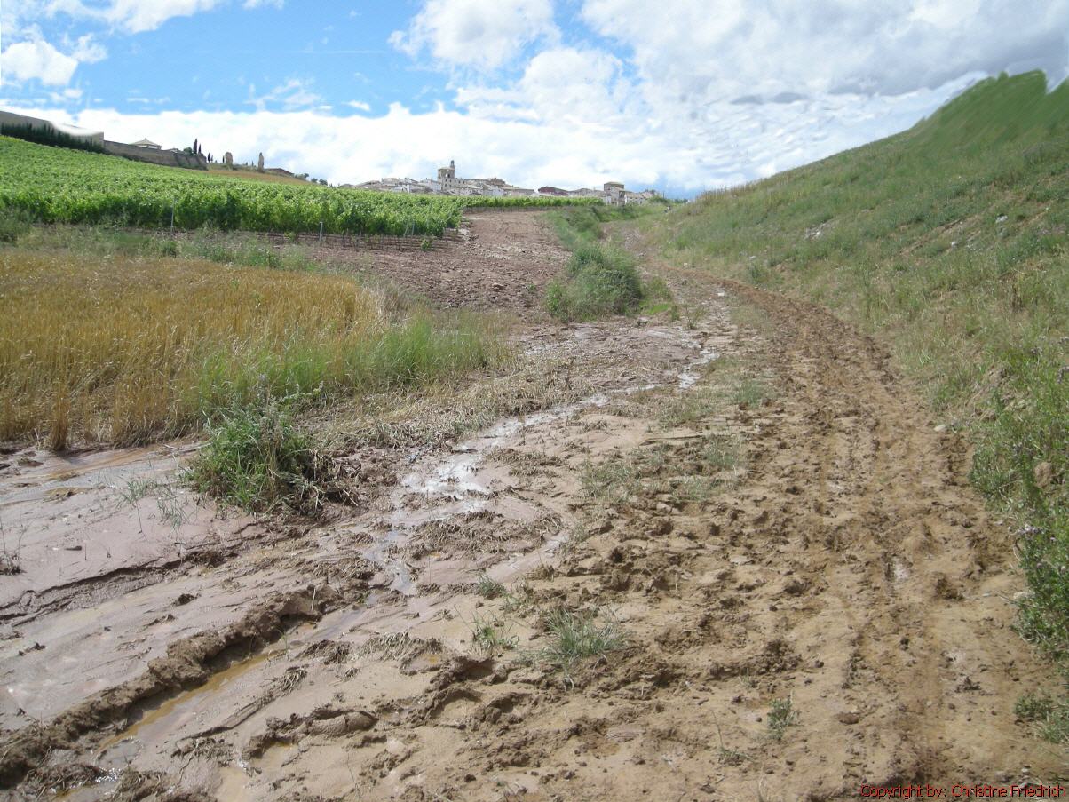 Um 13 Uhr gehen wir wieder weiter. Aber das war gar nicht so einfach. Der Weg ist durch den heftigen Regen vermurt und schlammig. Tiefrote Erde. Es ist wirklich schwer zu gehen, besonders bergauf. Zum Glück gibt es immer wieder Sträucher, an denen man sich hochziehen, oder festhalten kann. Für die Strecke von etwa 4,5 km - bis Maneru brauchen wir 2 ½ Stunden. Für die restlichen 2,3 km nach Cirauqui brauchen wir weitere 2 Stunden. Die Feldwege sind tief und aufgeweicht und unsere Schuhe schwer von der Erde.