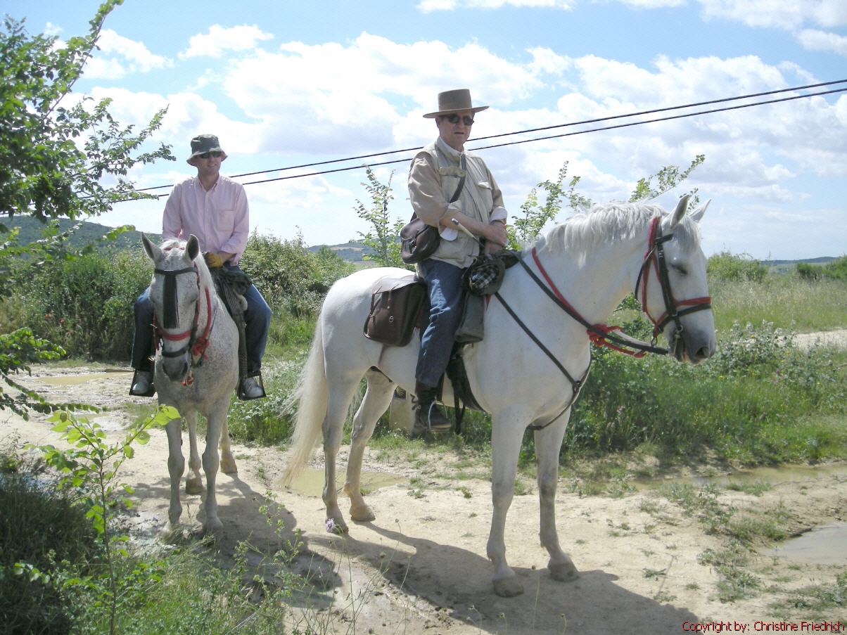 Zu dritt gehen wir um ½ 8 Uhr von der Herberge weg. Auf guten Feldwegen und bei schönem Wetter gehen wir bis Lorca, wo wir uns ein Frühstück gönnen. Eine schöne Piste mit herrlichen Feldblumen am Wegrand führt uns nach Villatuerta. Auch Caballeros (Pilger zu Pferde) treffen wir auf dem Weg. Nach einer kurzen Pause geht weiter bis Estella.