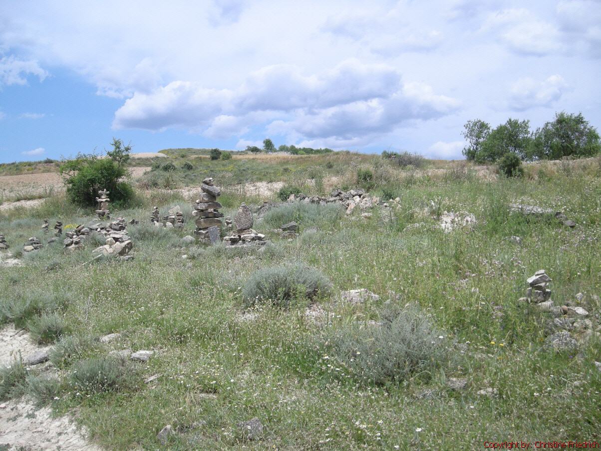 Der Weg nach Arcos ist landschaftlich wunder- schön und fast erholsam. Am Rand finden sich öfters Pilgermännchen aus Stein. Um die Mittagszeit kommen wir in Arcos an. Nach einer Stunde Rast gehen wir weiter. Zuerst will ich in Arcos bleiben, überlege es mir dann aber anders und gehe noch bis Torres del Rio mit Marina und Gianna. Nach einer herzlichen Verabschiedung suche ich die Herberge. Es ist 3 Uhr Nachmittag, die Sonne scheint und die Herberge – Casa Mari – ist nach der gestrigen Nacht ein Paradies. Im Zimmer sind 4 Stockbetten, also für 8 Leute. Dazu gibt es für jeden einen Kasten, in den der Rucksack hineinpasst und der zum zusperren ist. Es gibt hier schöne heiße Duschen, einen ordentlichen Platz um Wäsche zu waschen und auch genügend Leinen um sie aufzuhängen. In den ersten Stock kommt man über eine Stiege und sozusagen vor dem Zimmer ist die Terrasse mit schönem Ausblick auf die Kirche und Umgebung. Die Sonne scheint warm und die Wäsche kann gut trocknen. Ich spaziere in den Ort, kaufe mir etwas fürs Abendessen und genieße den Ausblick in Ruhe auf der Terrasse. Richtig erholsam! Ich treffe Peter aus Deutschland, der mindestens das sechste Mal auf dem Jakobsweg ist. Er war auch schon eine Zeit als Herbergsvater auf dem Camino. Außerdem ist da noch eine kleine Koreanerin Suy (klein von der Körperlänge). Sie ist auf einem Europa-Trip und nimmt noch schnell den „Camino“ dazu. Ich begegne ihr einige Male auf dem Weg. Zum letzten Mal in Santiago im Pilgerbüro, wo ich ihr noch eine gute Heimreise wünschen kann.