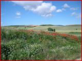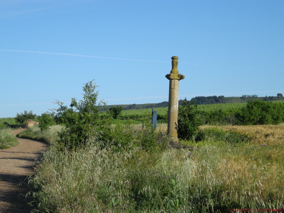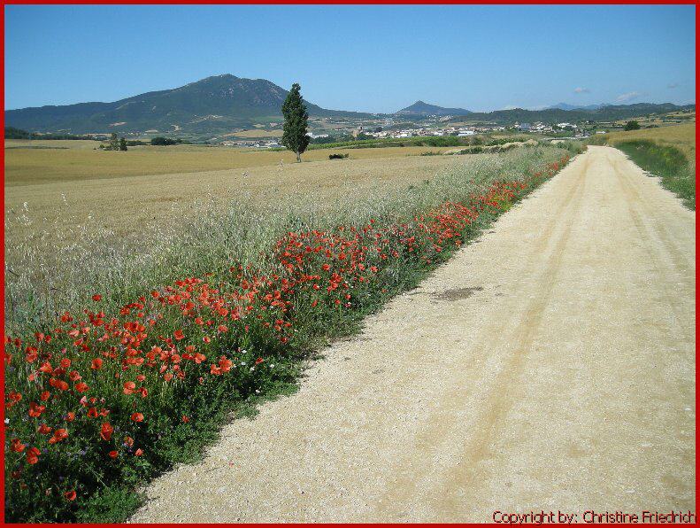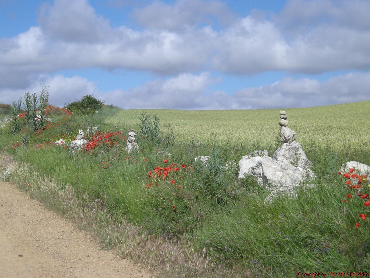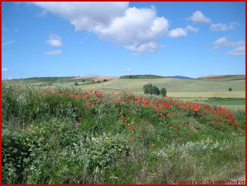 Ich bin fast allein auf der Piste. Zwei oder drei Pilger haben mich überholt. Die Landschaft ist wunderschön und abwechslungsreich. Viele Weingärten, Getreidefelder mit Mohn- und Kornblumen.