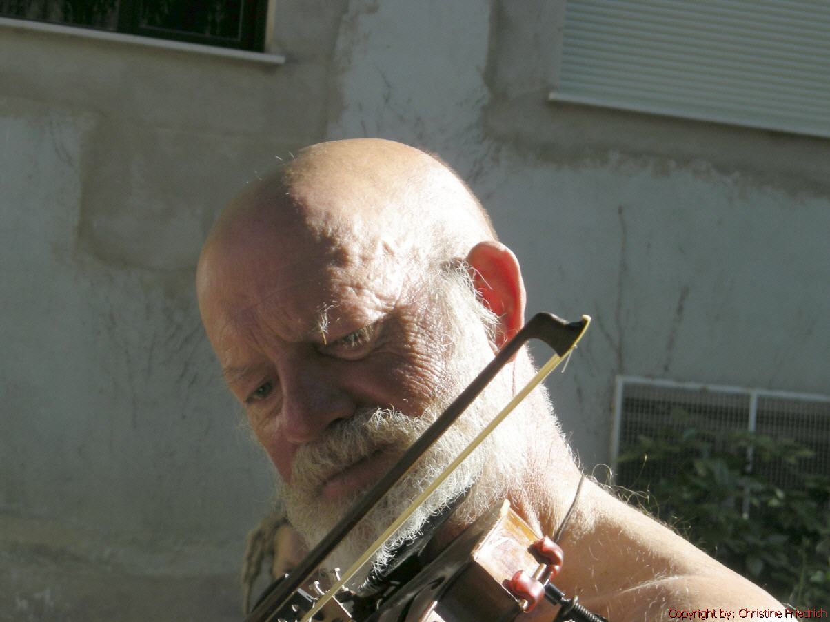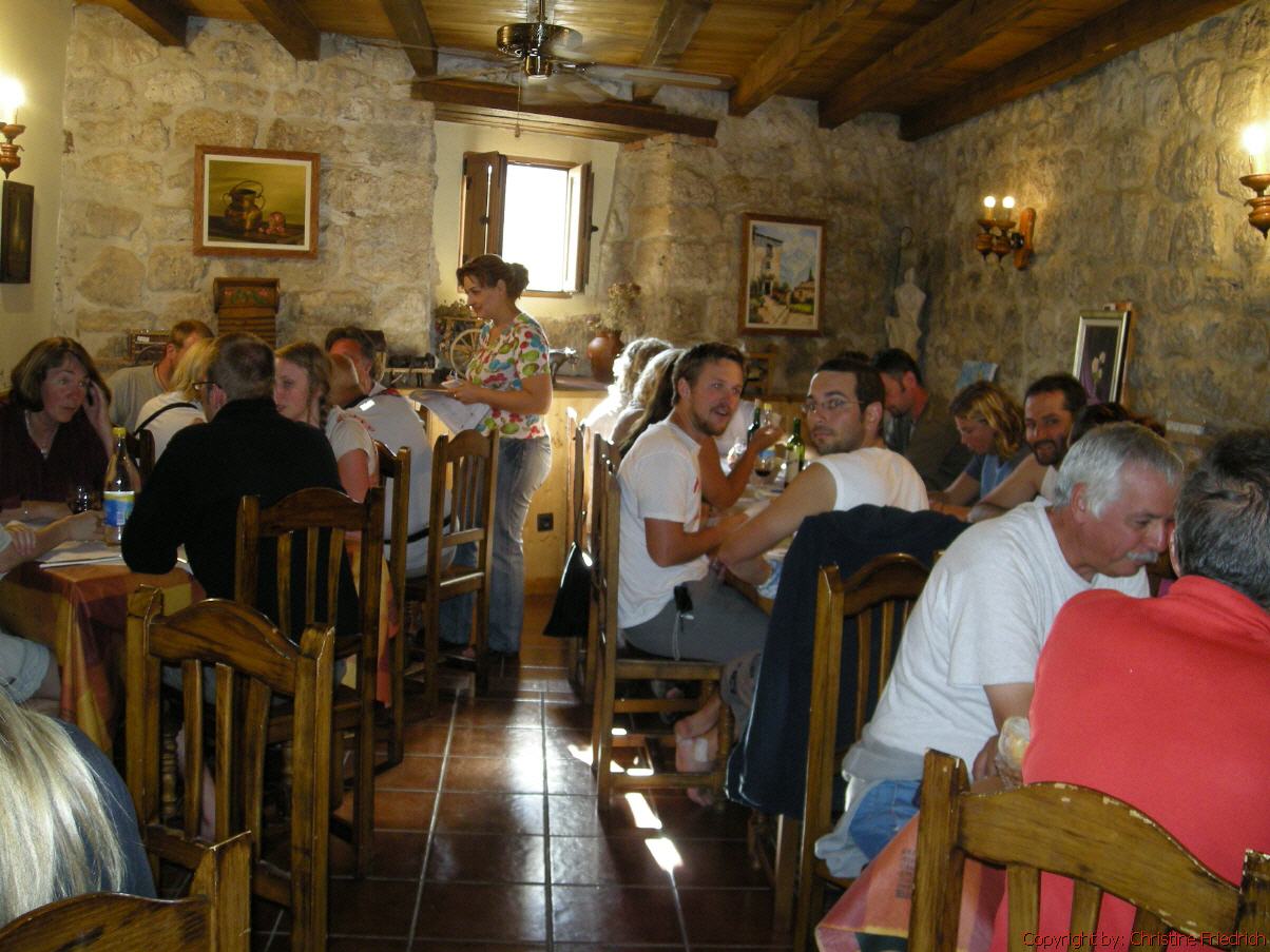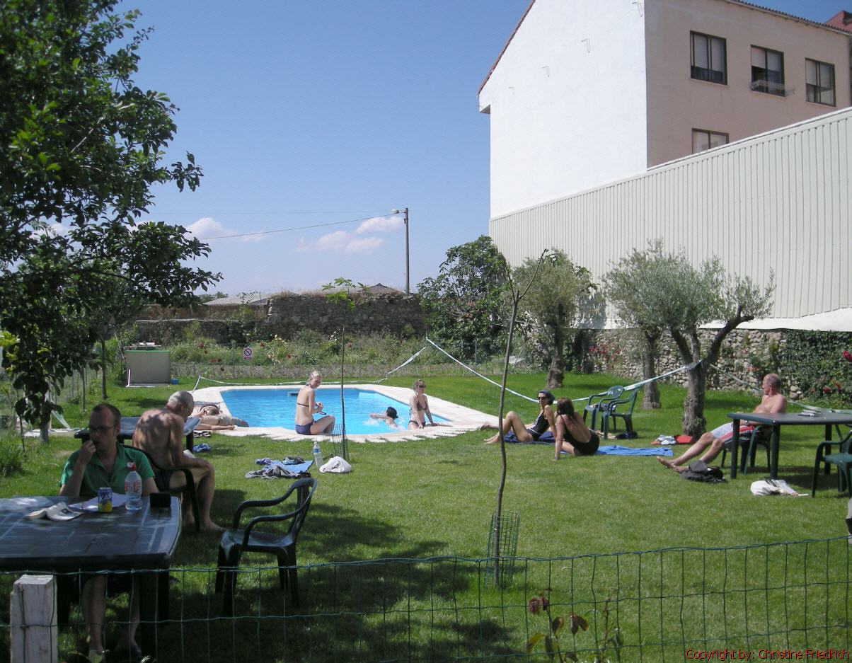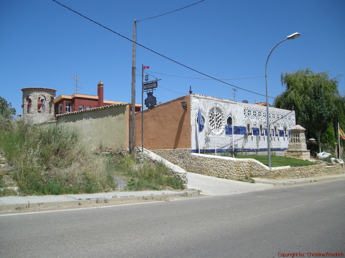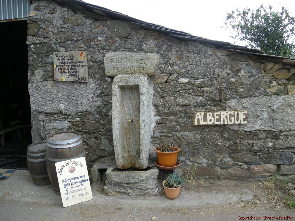 Gleich neben der Herberge, die im übrigen von freiwilligen, älteren Damen geführt wird, gibt es eine „Bar“. Gut zu sitzen und dem Treiben vor der Herberge zuzusehen. Ich bleibe nicht lange allein. Man trifft immer wieder Bekannte. Heute begegne ich zum ersten Mal einem alten Mann aus Deutschland. Er hat seine Geige mit. Das Geige spielen hat er sich selbst beigebracht. Ich komme mit ihm ins Gespräch und wir reden über Gott und die Welt. Es war richtig schön!