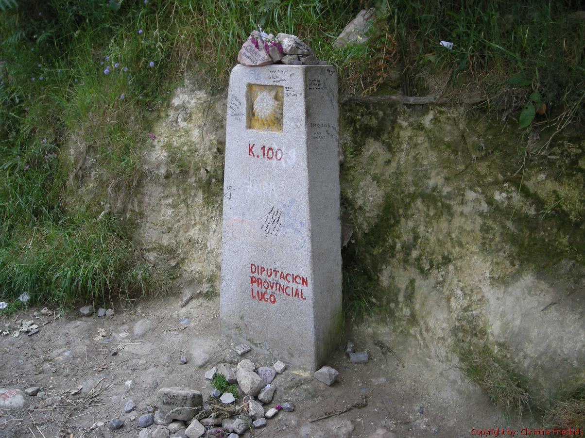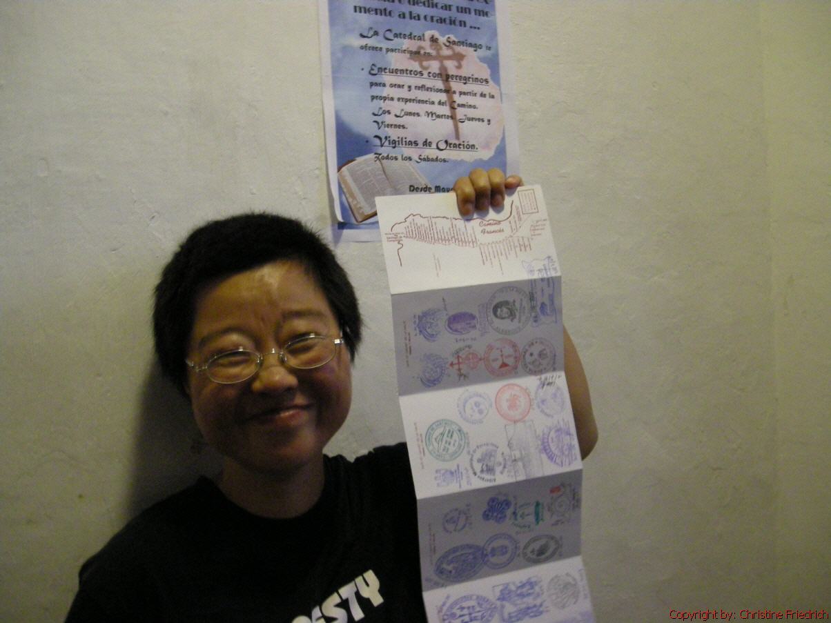 Wie üblich um ½ 7 Uhr weg. Sehr nebelig, aber nicht kalt. Um 7:15 war ich in Arzúa. Hab dort gefrühstückt. Um 7:45 weiter. 10:15 in Boavista und um 10:45 in Salceda. Der Nebel ist noch nicht besser geworden. Regenjacke angezogen und Rucksackschutz draufgegeben. Um ½ 12 war ich in Ras. Bei Brunnen ½ Stunde Rast. Die Sonne kommt heraus, und es wird schön. Um 14:30 in der Herberge von Pedrouzo! Nach einem Umweg von ¾ Stunden. Ein Oberschlauer hat nicht nur mir eine falsche Auskunft gegeben. Wir sind unnötigerweise über den Berg gegangen und mussten wieder retour, praktisch zum Ausgangspunkt. Die Herberge ist voll. Sämtliche Jugendgruppen oder Organisationen, die ich schon öfters auf dem Weg getroffen hatte, sind hier. Die späte Ankunft hatte aber auch einen Vorteil: ich habe im Erdgeschoss einen Platz bekommen. Allerdings war um diese Zeit auch Siesta – alles geschlossen! Später in ein Cafe: heiße Schokolade und Kuchen; das war Mittagessen und Jause in einem. Um ½ 6 war ich einkaufen: O-Saft und etwas Schinken. Hatte noch Zwieback und Eckerlkäse. Das war mein Abendessen. In der Apotheke neue Wundkompressen und Pflaster gekauft. Morgen bin ich in Santiago!