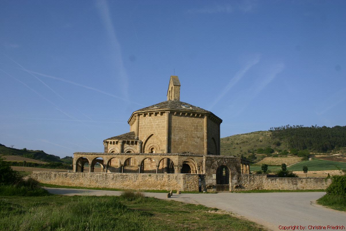 Um 7 Uhr gehen wir von der Herberge weg. Anfangs ist es nur bewölkt, doch kurze Zeit später beginnt es zu regnen. Wir wählen den Weg über Muruzábal nach Santa Maria de Eunate. Die Kirche von Eunate ist ein Kleinod am Jakobsweg. Seit 800 Jahren liegt sie allein, abseits der Strasse, zwischen Feldern und Wiesen. Die Form ist ungewöhnlich: Statt eines länglichen Kirchenschiffes bildet sie ein etwas unregelmäßiges Achteck. Möglicherweise wurde es von den Rittern des Templerordens gebaut, als Nachbildung der Grabeskirche in Jerusalem. Leider ist die Kirche zugesperrt!