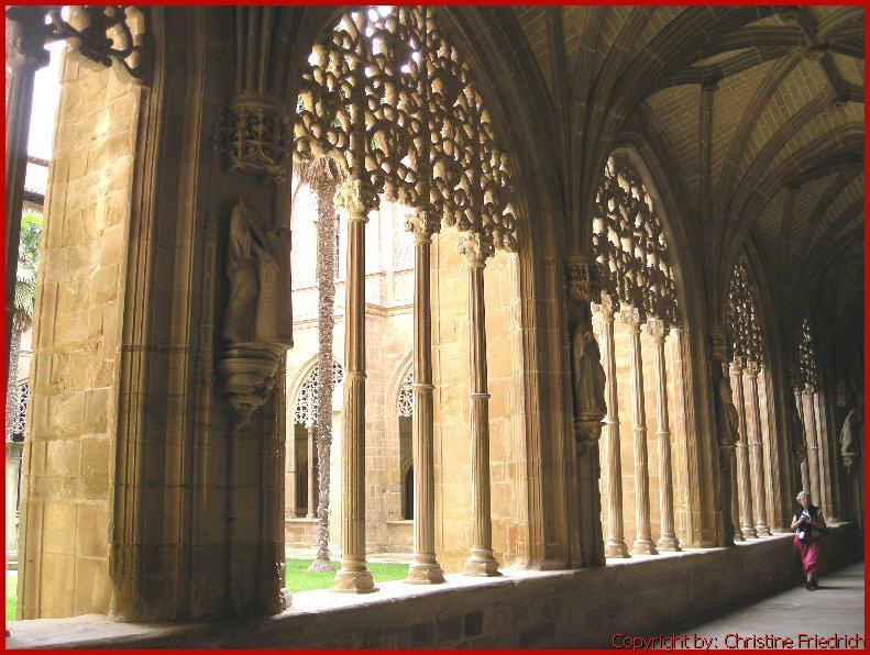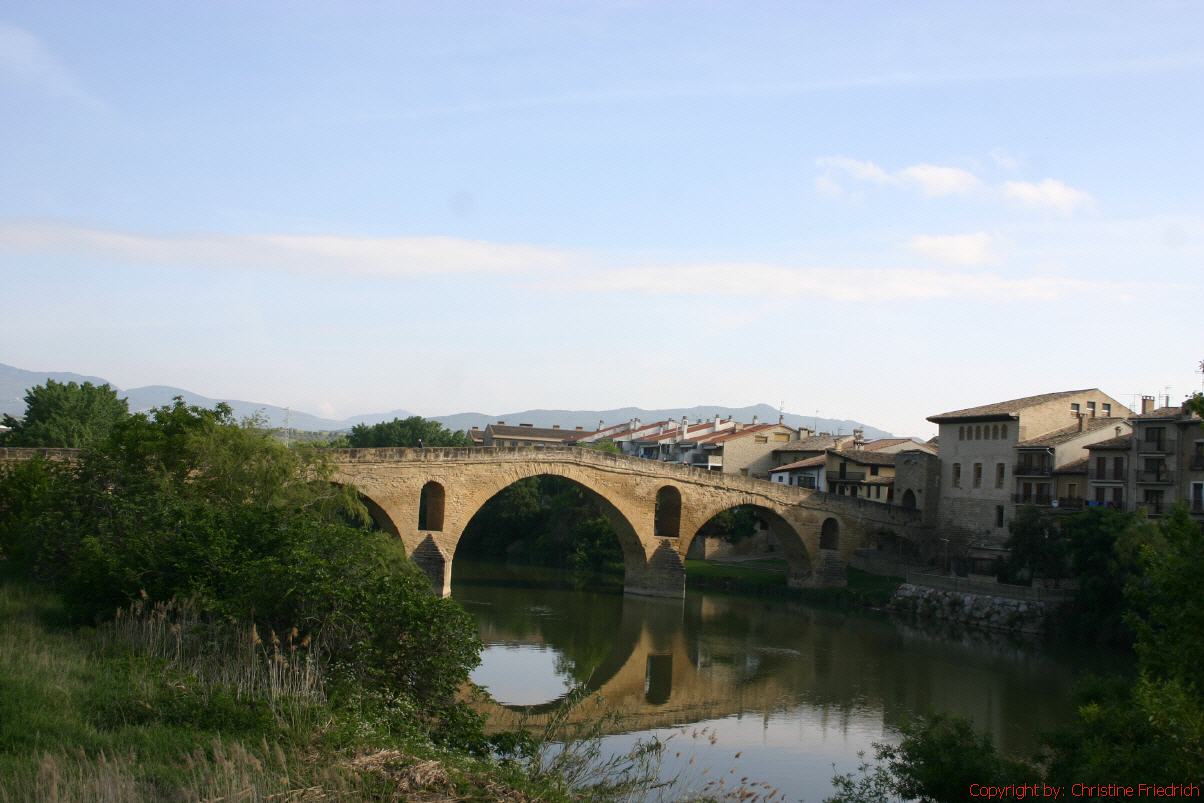 Wir gehen über Obanos, fast hätten wir den falschen Weg genommen. Endlich eine Gelegenheit für ein Frühstück. Auf unserem Weg weiter in Richtung Puente la Reina begegnen wir einer Pilgergruppe aus Süddeutschland. Sie sind mit einem Autobus unterwegs und gehen immer wieder einige Kilometer zu Fuß. Es sind solche Wege, wo auch Behinderte mitgehen können. Es fängt wieder zu regnen an. Gott sei Dank ist am Ortsanfang von Puente la Reina gleich eine Kirche. Es ist halb 12 h und Gottesdienst. Wir bleiben bis zum Schluss. Nach dem Gottesdienst sehen wir uns die Kirche und die Stadt an.