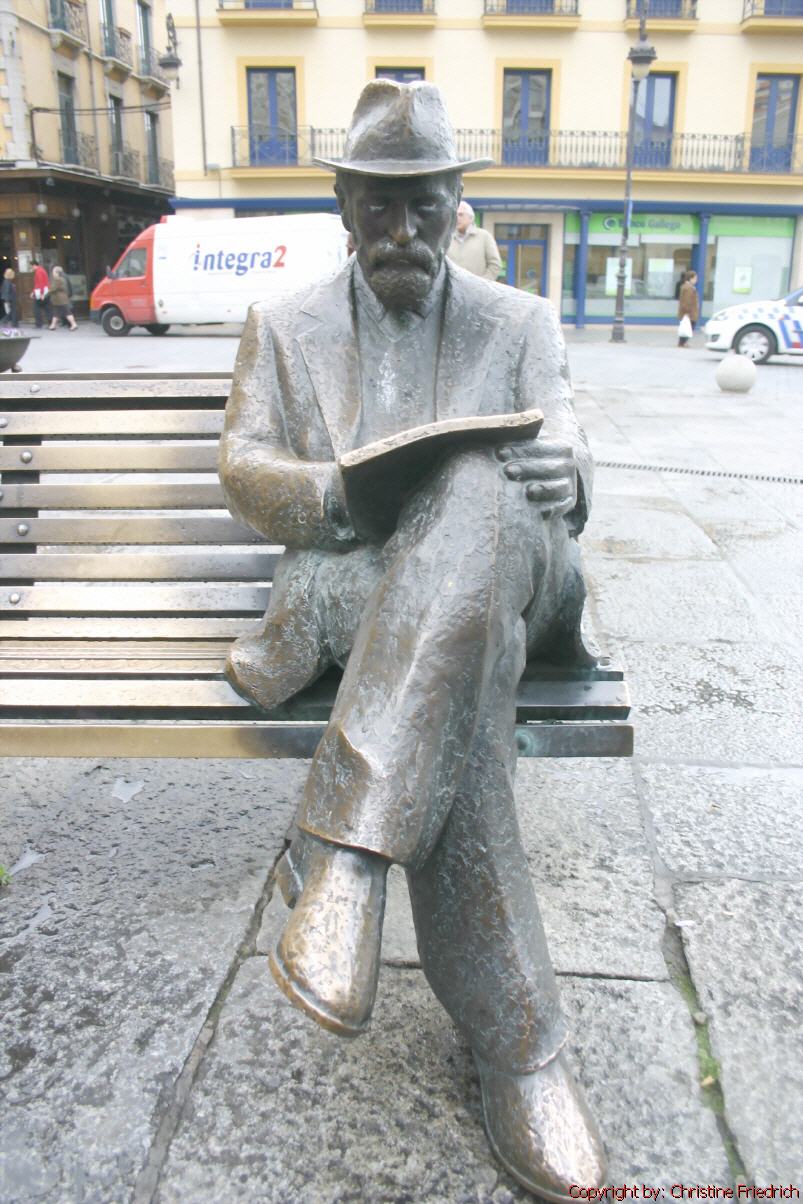 Rucksack 9 Kilo – wackeliger Bus - schaffe ich es mich niederzusetzen. Die Fahrt dauert etwa 35 Minuten bis zum Busbahnhof. Wo ist der Bus nach nach Pamplona? Obwohl ich keine Spanisch spreche komme ich gut zurecht. Auch mit dem etwas fremden System. Man muss zuerst zum Kartenschalter; dort bekommt man die Karte mit der Busnummer, der Abfahrtszeit und dem nummerierten Sitzplatz. Dann erst kann man zum Autobuschauffeur gehen und ihn bitten, den Rucksack hineinzugeben. Was er allerdings nicht tut. Ich muss es selber machen. Dabei schlage ich mir gleich zweimal meinen Kopf an der hochgeklappten Tür an. Ich bekomme eine Beule bzw. eine kleine Platzwunde. Tut fast eine Woche weh. (Dasselbe Spielchen, nur in umgekehrter Reihenfolge, wiederholt sich, als ich in Pamplona meinen Rucksack wieder heraushole: auch wieder ein Stoß auf dieselbe Stelle.)
