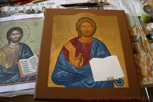 Auch die Ikonenmalerei hat mich interessiert. Daher habe ich mir eine Woche mit einem Ikonenmaler geschenkt. Die Ikone ist leider nicht fertig geworden, da ich nicht in Konkurrenz mit einem anderen Pfarrmitglied treten wollte.